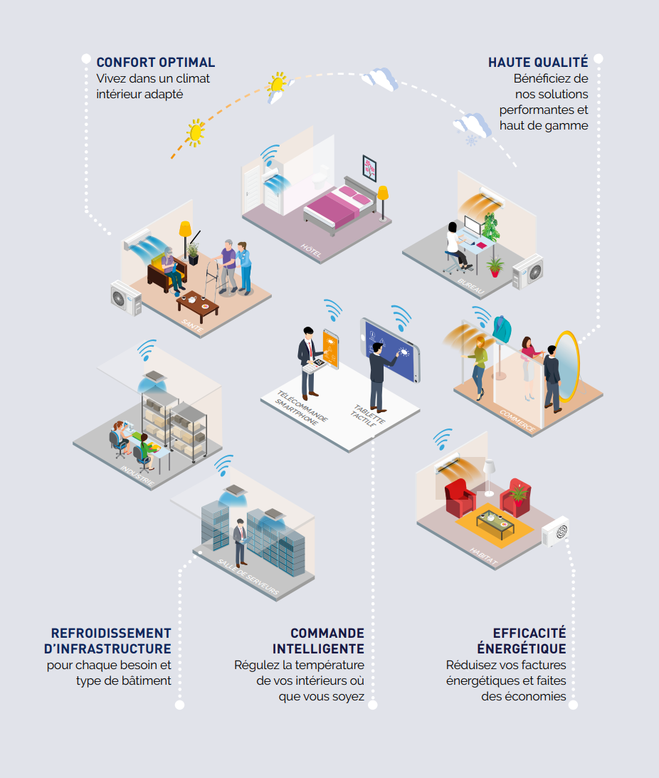 • Nous imaginons des solutions sur mesure adaptées à la diversité de tous les environnements : l’industrie, le tertiaire, la logistique, le secteur résidentiel, les installations de loisirs, les hôtels restaurants et autres commerces, etc.